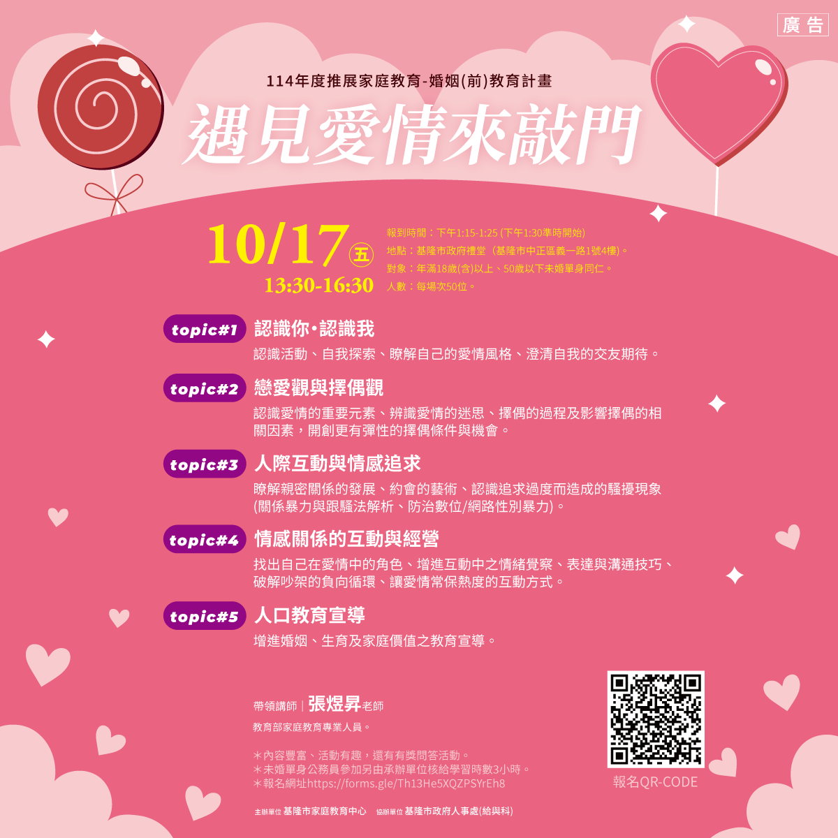 一、旨揭課程與活動訂於114年10月17日(週五)下午1:30至4:30假本府4樓禮堂舉行,邀請教育部家庭教育專業人員同時也是生活美學玩家張煜昇老師帶領,活動單元與內容如附件簡章。