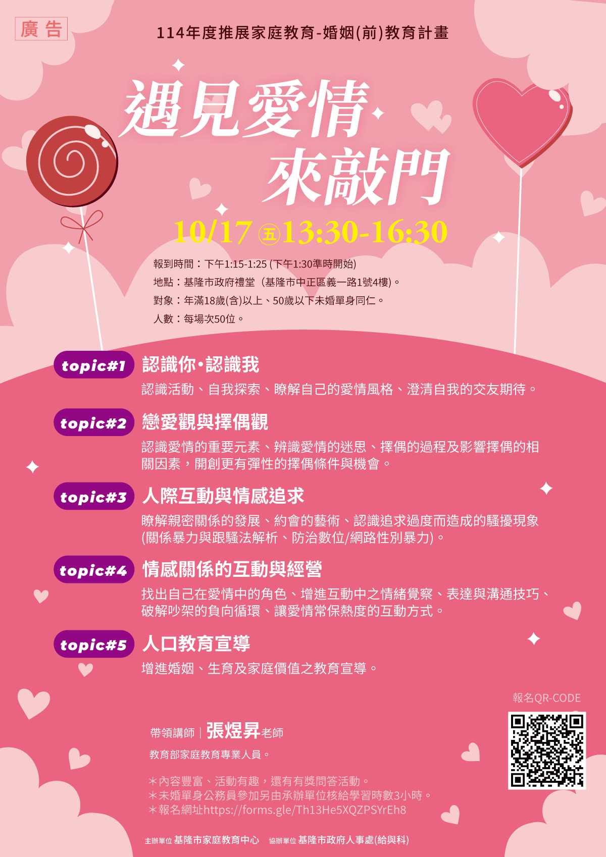 三、報名網址 https://forms.gle/Th13He5XQZPSYrEh8 或掃描文宣QR-Code報名,如有相關問題可聯繫基隆市家庭教育中心(02)2427-1724盧小姐。